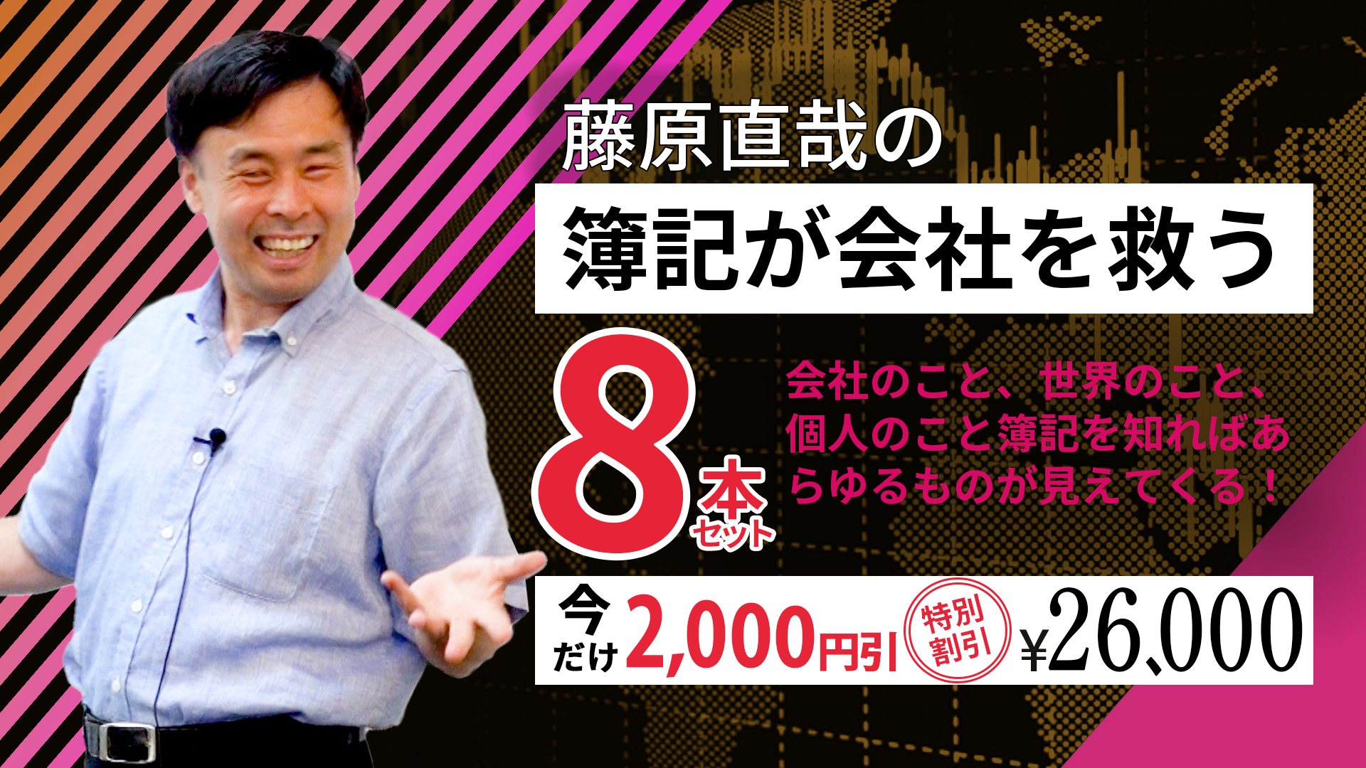 ぜひ、藤原先生のワールドワイドな視点で簿記について語る「藤原直哉の簿記が会社を救う」8本セットで、今までと違う新しい世界に飛び出しましょう。